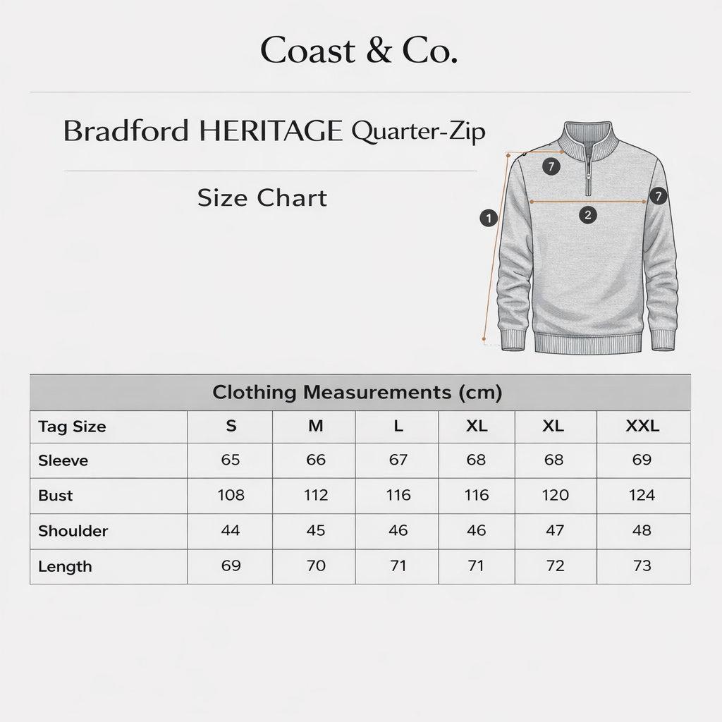 The Bradford HERITAGE Quarter-Zip is a refined essential for cooler days. Crafted from a soft cotton blend with added stretch, it delivers warmth, comfort, and an easy, tailored feel.