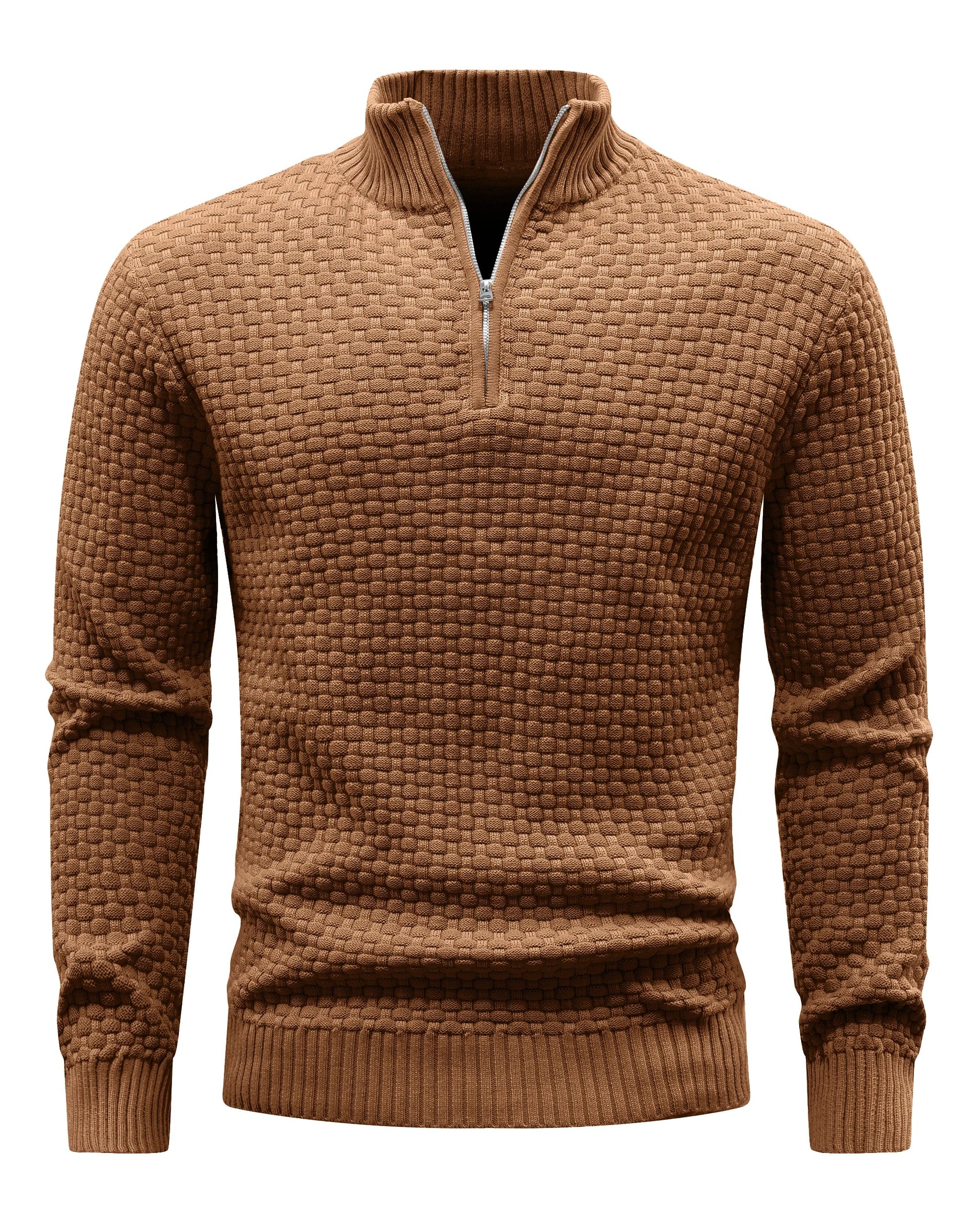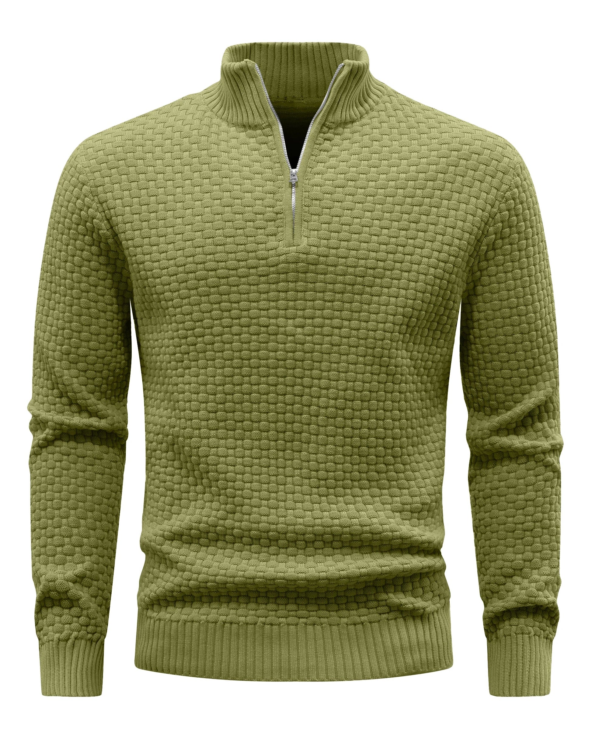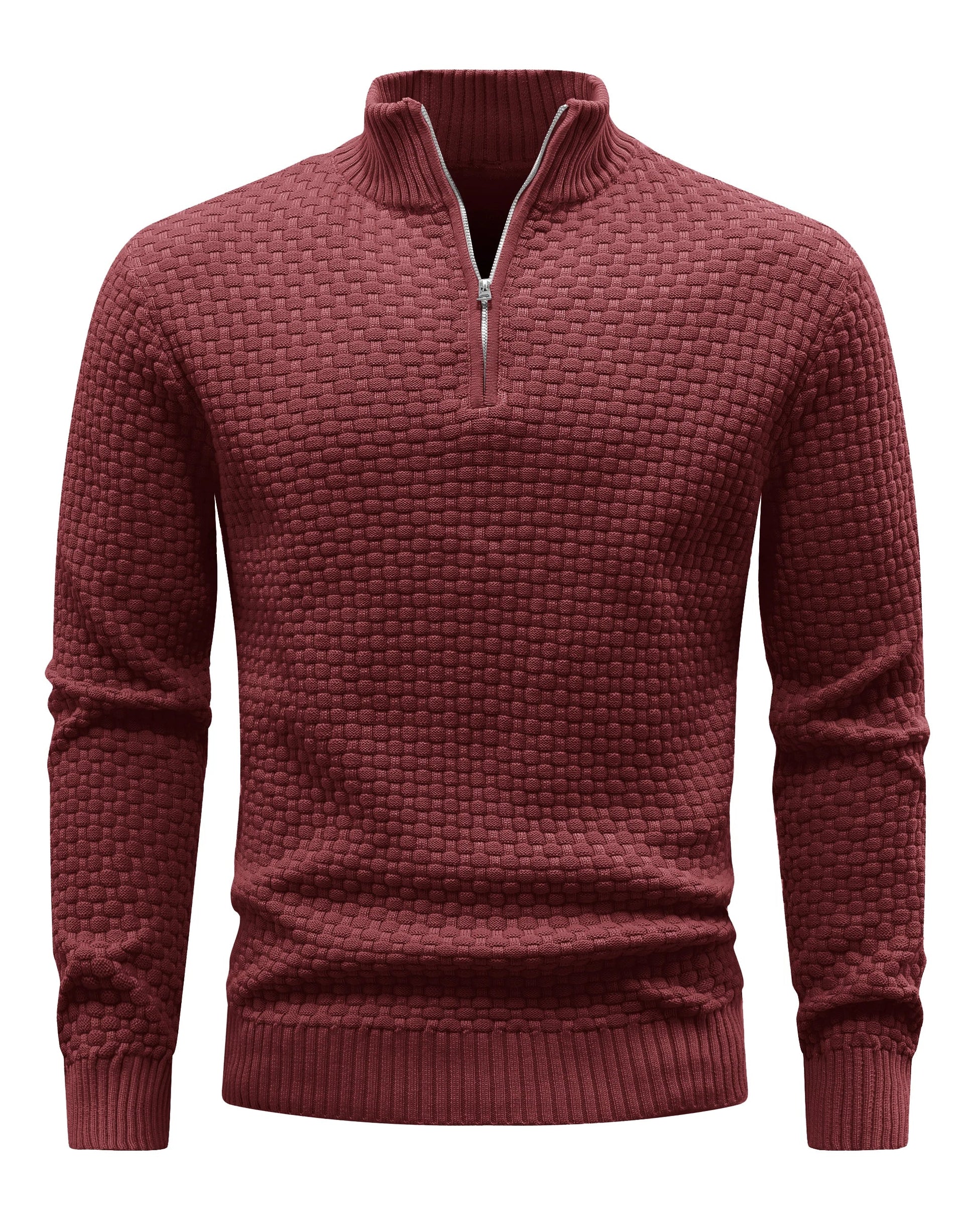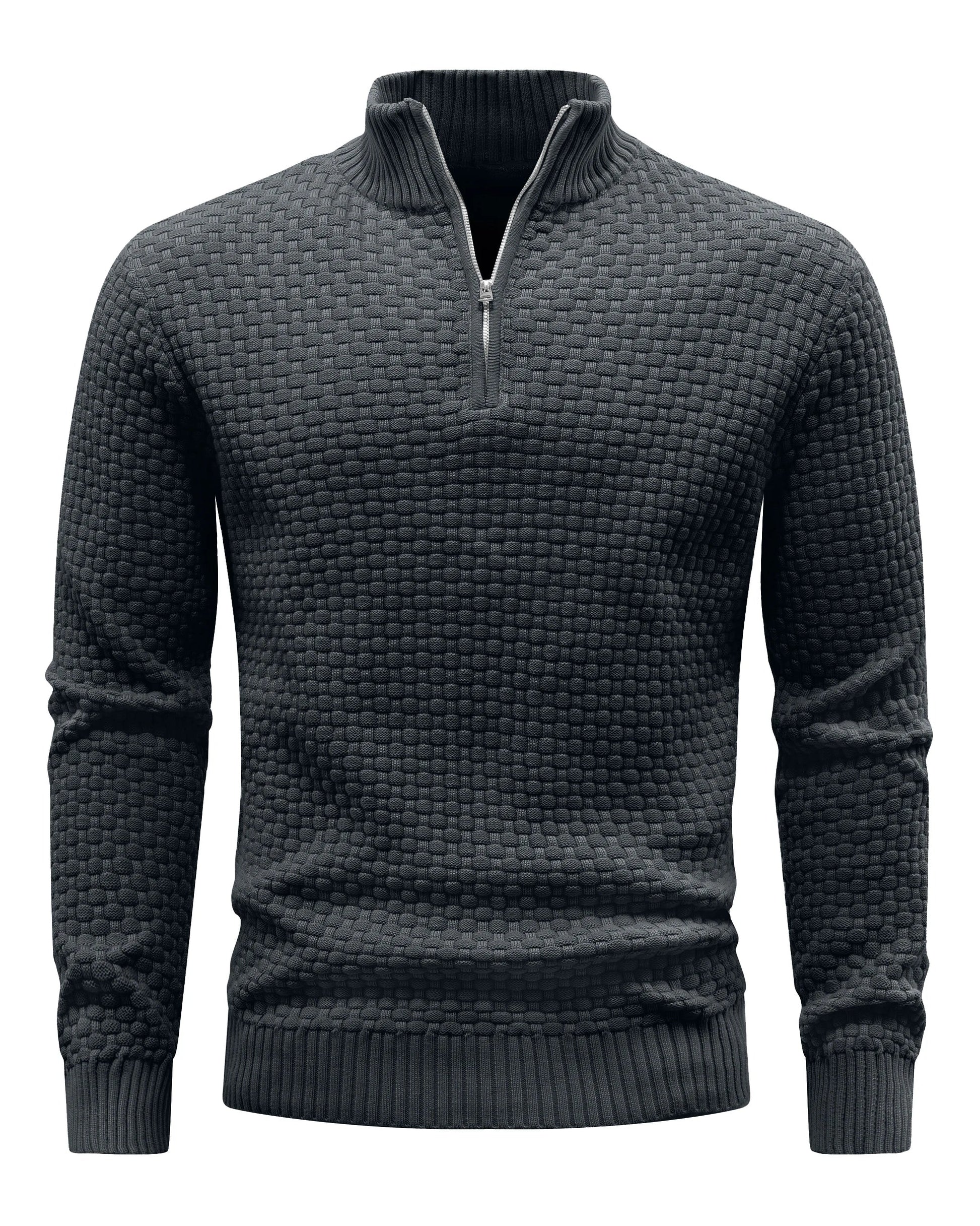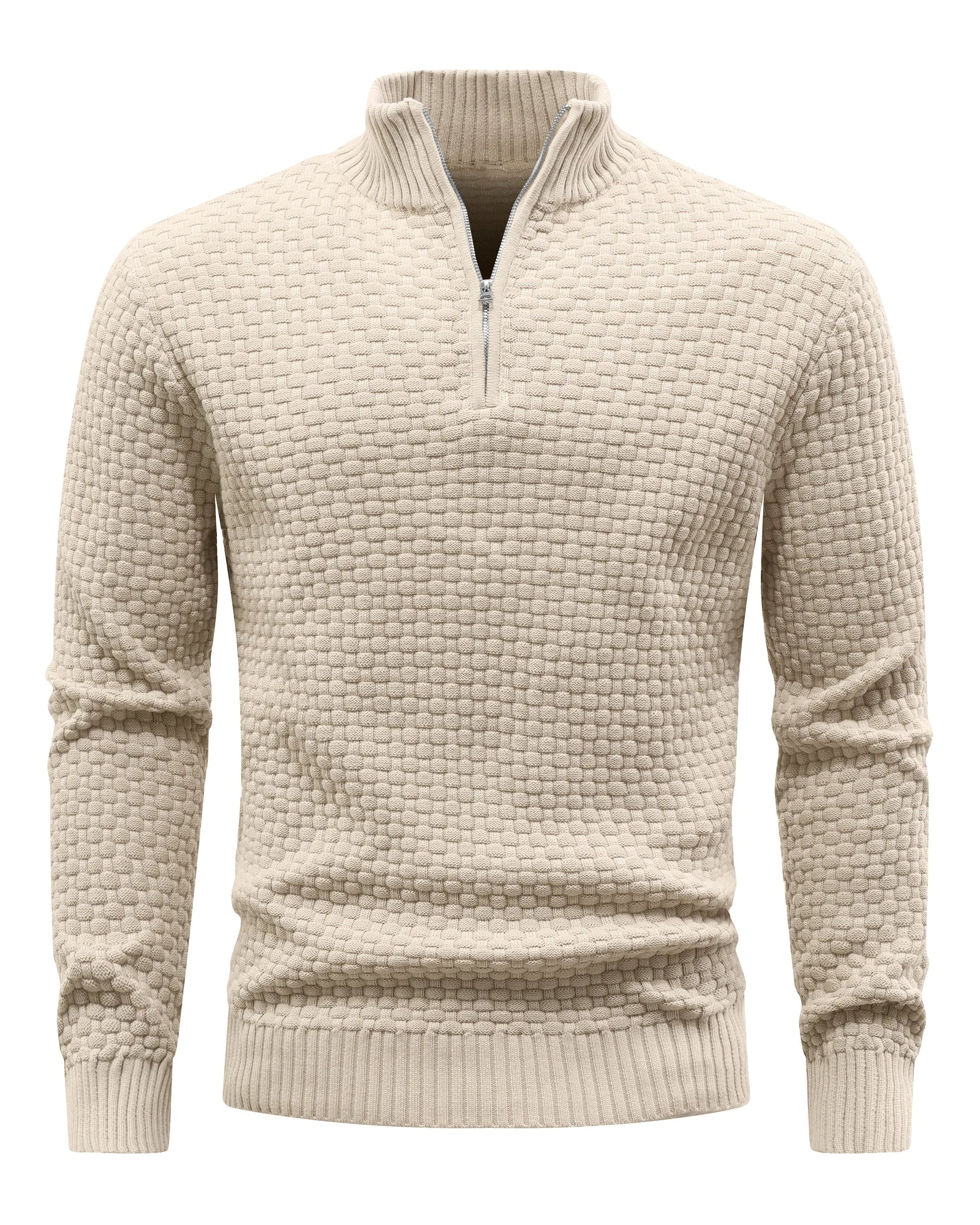 Designed with a structured stand collar, quarter-zip neckline, and ribbed trims, it layers effortlessly over a shirt or under a jacket for a polished smart-casual look across cooler seasons.